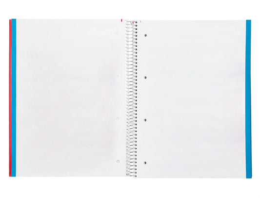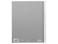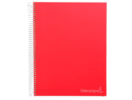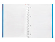 Capa de cartão colado de 1,5 mm de espessura, forrado com papel revestido mate de 135 g/m². Capa interior branca. Papel de 75 g/m2. Microperfurado. 140 folhas. Bandas de 5 cores.