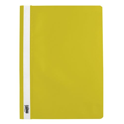 Fabricado em polipropileno, formato A4, com ferragem, capa transparente e contracapa opaca. Identificador na lombada.