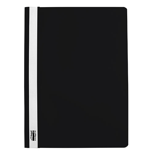 Fabricado em polipropileno, formato A4, com ferragem, capa transparente e contracapa opaca. Identificador na lombada.