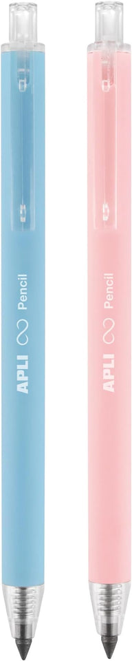 Lapiseira Infinita com design inovador, a mina é armazenada dentro do Lápis, mantendo-a protegida e pronta a ser utilizada. Vem apresentado num num Blister com 2 lapiseiras em 2 cores diferentes: Azul e Rosa. O lápis infinito é perfeito para quem procura durabilidade e conforto num único produto. A maneira mais confortável de escrever ou desenhar sem se preocupar com quebras!