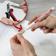 Marcador de tinta para rotulagem altamente opaca e permanente, mesmo em materiais escuros e transparentes, metal, metal quente, vidro, plástico, madeira seca, cartão e couro.
