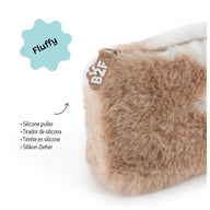 poliéster felpudo com fecho de correr na parte superior, puxador de silicone e aplicação decorativa.