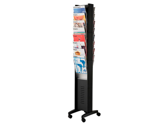 Expositor fast-paperflow de chao movel dupla face 16 divisorias cor preto. Este prático e elegante expositor móvel frente e verso é a solução ideal para quem procura otimizar a organização e exposição de materiais impressos em espaços comerciais ou educativos. Com capacidade para 16 caixas, este produto alia a funcionalidade a um design moderno, permitindo a máxima visibilidade do seu conteúdo a partir de qualquer ângulo.