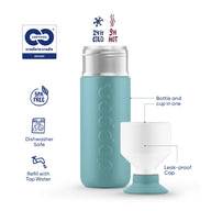 Design em três partes: fácil de encher, fácil de desmontar para limpar e transforma a metade superior da garrafa numa chávena ou copo
