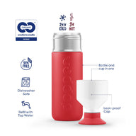 Design em três partes: fácil de encher, fácil de desmontar para limpar e transforma a metade superior da garrafa numa chávena ou copo
