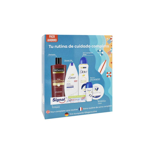 A sua rotina de cuidados completa. Este conjunto inclui: Gel de Duche Dove 250 ml Desodorizante Spray Dove 150 ml Desodorizante Roll-on 50 ml Creme Dove 750 ml Champoo Tresemmé 400 ml Pasta de dentes Signal 75 ml