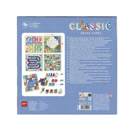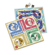 Quatro jogos de tabuleiro clássicos reunidos num só com ilustrações adoráveis: o jogo do ganso, ludo, quatro em linha e jogo das escadas.