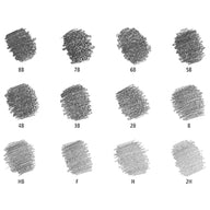Caixa metálica com 12 lápis, graduações: 8B, 7B, 6B, 5B, 4B, 3B, 2B, B, HB, F, H, 2H