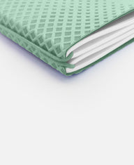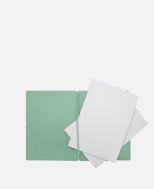 Capa com 2 cadernos agrafados A5 no interior 1 pautado + 1 liso. 40 folhas de 80gr em cada caderno.