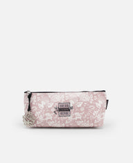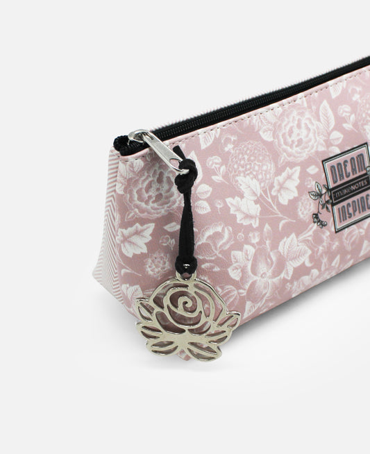 Necessaire Médio Triangular 21x9x6 cm com fecho de correr e pendurante em formato de flor, em pele sintética impressa eco-friendly (sem origem animal e livre de ftalatos). Também é repelente à água e utiliza tintas ecológicas à base de água.