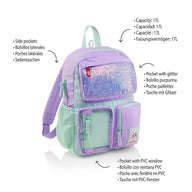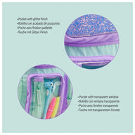 com 1 compartimento principal amplo e 3 bolsos frontais com fecho de correr, incluindo um com janela PVC para visualizar o conteúdo e outro com acabamento brilhante.