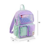 dimensões de 300 x 400 x 130 mm, oferecendo grande capacidade para livros, estojos, dossiers e outros acessórios escolares essenciais.