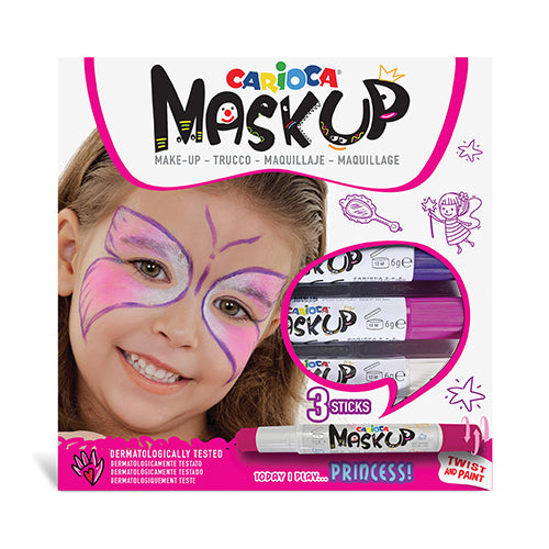 Hoje vou brincar de....Princesa! Sê quem tu quiseres ser com a Carioca Mask Up, as novas cores para a pele. Roda a barra de maquilhagem e utiliza como se fosse um marcador. Cores Brilhantes e laváveis, dermatologicamente testado. As cores podem se misturar entre elas. Aplicam-se directamente na pele sem juntar água. Pode retirar facilmente com água e sabão.