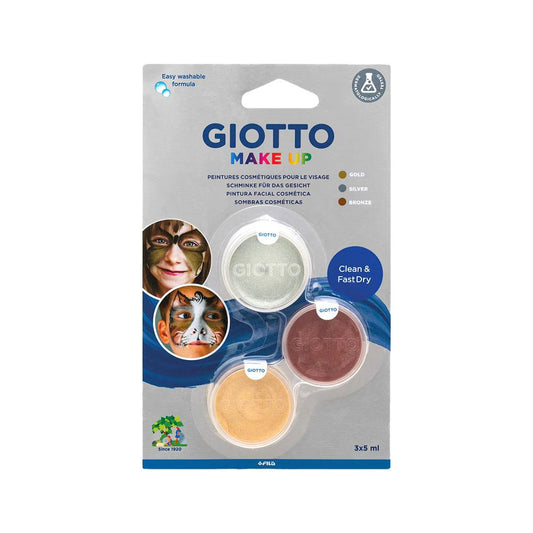 Maquilhar é divertido! Transforma as tuas pinturas numa obra de arte com a Giotto Make Up. Conjunto de tintas faciais, formuladas para secar rapidamente e serem facilmente removidas da pele com água. As cores de maquiagem Giotto são suaves e fáceis de aplicar. Secam rapidamente e podem ser facilmente removidos com água. Cores: Ouro, Prata e Bronze. Blister de 3 tintas faciais de cor metálica de 5 ml. Aviso de segurança: Evite contato com os olhos e lábios. Em caso de contato com os olhos, enxágue abundantemente com água. Aplique apenas na pele ilesa e não irritada. Instruções de lavagem: Lavar com água e sabão. Remova qualquer resíduo com produtos de limpeza de pele. Conservar em local fresco e seco, com temperatura não superior a 35°C. Indicado para crianças +4 anos. Com supervisão de adultos.