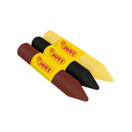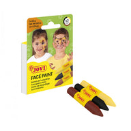 Cores: Preto, Castanho, Amarelo. Estojo com 3 sticks de maquilhagem nas cores vermelho, branco e preto. Torne-se um bravo pirata ou um simpático palhaço combinando estas três cores para criar uma infinidade de personagens extraordinárias e divertidas para a sua festa de fantasia, carnaval ou Halloween. Aproveite a festa com JOVI! A maquilhagem JOVI FACE PAINT é um produto seguro e inofensivo para todos os tipos de pele e testado dermatologicamente. A sua formulação à base de gordura remove confortavelmente e é facilmente limpa com um pano húmido ou água e sabão. Os sticks de maquilhagem têm uma textura macia que se aplica sem esforço na pele das crianças. Truque duplo: afie-o para maior precisão e misture as suas cores brilhantes e de alta cobertura para descobrir novos tons. Maquilhagem segura e inofensiva, para todos os tipos de pele. Limpa facilmente com um pano húmido ou água e sabão. Desenhado e fabricado em Barcelona. Barra de 5,6 gr. Textura de aplicação agradável. Gentil. Resistência térmica. A maquilhagem em stick pode ser afiada. Cores atraentes que podem ser misturadas entre si. Cores vivas e de qualidade. Elevado poder de cobertura. Maquilhagem com base oleosa. Limpa facilmente com um pano húmido ou água e sabão. Testado dermatologicamente.