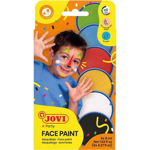 A tinta facial JOVI é um produto de base gordurosa e muito fácil de aplicar sem usar água. Com grande capacidade de cobertura, está disponível em 12 cores vivas e vivas que podem ser misturadas entre si. Apresenta-se em formato de frasco que facilita a inserção de uma esponja para aplicação posterior. Sua base gordurosa evita o ressecamento do produto. É facilmente removido com um pano sem necessidade de água e sabão. Seca rapidamente sem deixar sensação gordurosa. Não contém parabenos e é livre dos principais alergéneos.