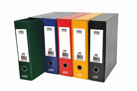 Arquivador em cartão, revestido a papel plastificado colorido, com caixa. Com etiqueta impressa e óculo.