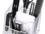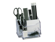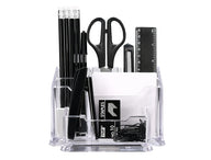 Organizador de secretaria com 15 acessorios transparente. Conjunto de escritório transparente, composto por 14 peças. 4 lápis, 2 esferográficas, 1 x-ato, 1 tesoura, 1 régua 15cm, 1 borracha, 1 agrafador, 1 caixa de agrafes nº10, 30 clips, 1 post-it. Medidas: 154 x 105 x 100 mm.
