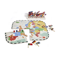 Inclui 1 tabuleiro com o mapa da Europa, 45 bandeiras de diferentes países e 1 folheto explicativo com a bandeira e informações relevantes de cada país em 10 línguas diferentes: nome do país, área, população, capital, moeda, línguas.