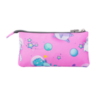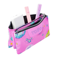 Estojo produzido em material eco-friendly RPET, com 22 x 11 x 3,5 cm, e 2 fechos e 3 compartimentos.