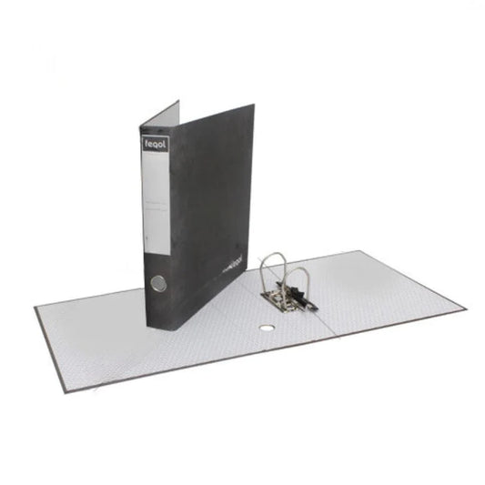 Pastas de arquivo com ferragem de 2 argolas em D de 35mm. Compressor em plástico, óculo em aço cromado. Porta etiquetas na lombada. Cartão microcanelado.