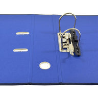 Arquivador azul escuro, em cartão revestido a papel plastificado. Com porta etiqueta, rado e óculo.